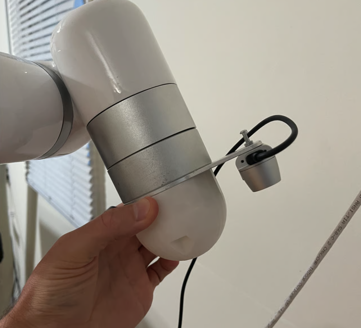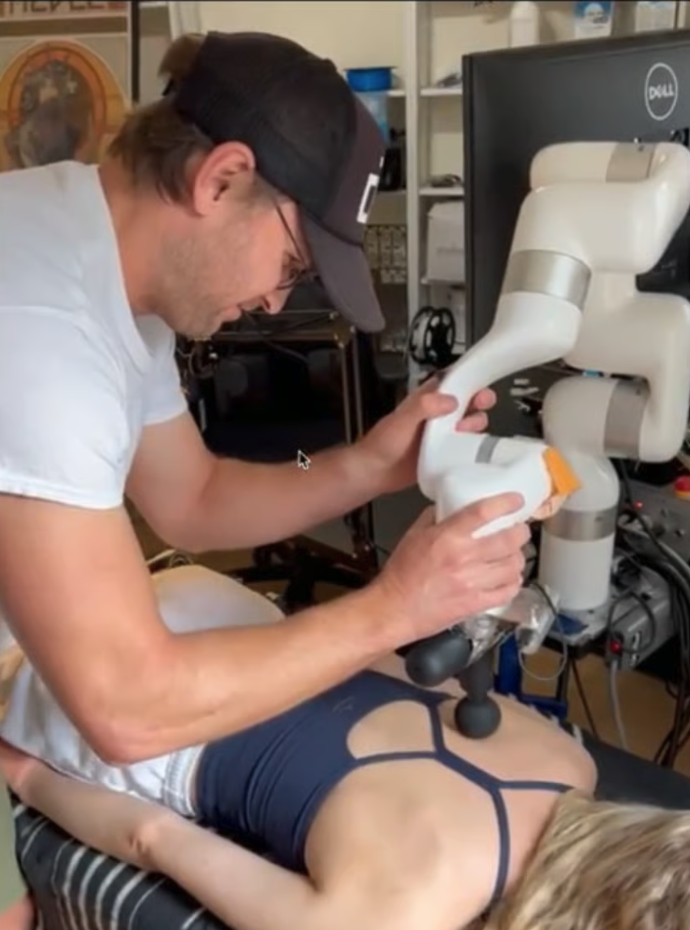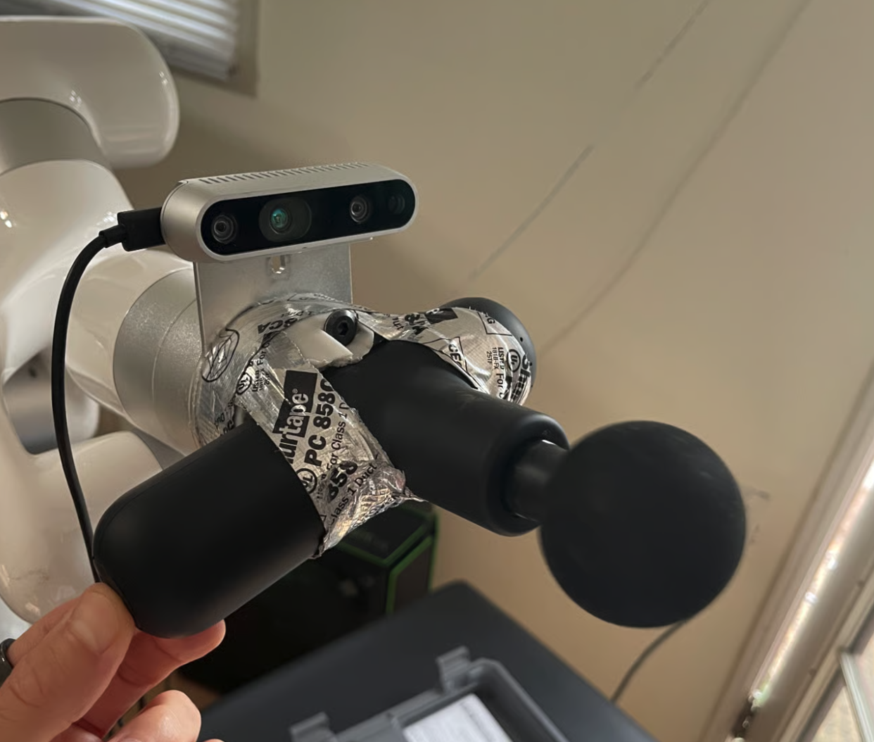 I broke out my dusty 3D printer, which I haven’t used in probably six years, and started designing an attachment to connect the TheraGun to the robotic arm. After a few iterations, my 3D printer broke, so I decided to Dremel out a decent enough attachment and duct-taped the TheraGun to the arm. I grabbed my partner and started doing a small sample massage by guiding the robot with my hands, moving the joints as if the robot was giving the massage. I recorded all of the joint positions and camera info to use as training data.