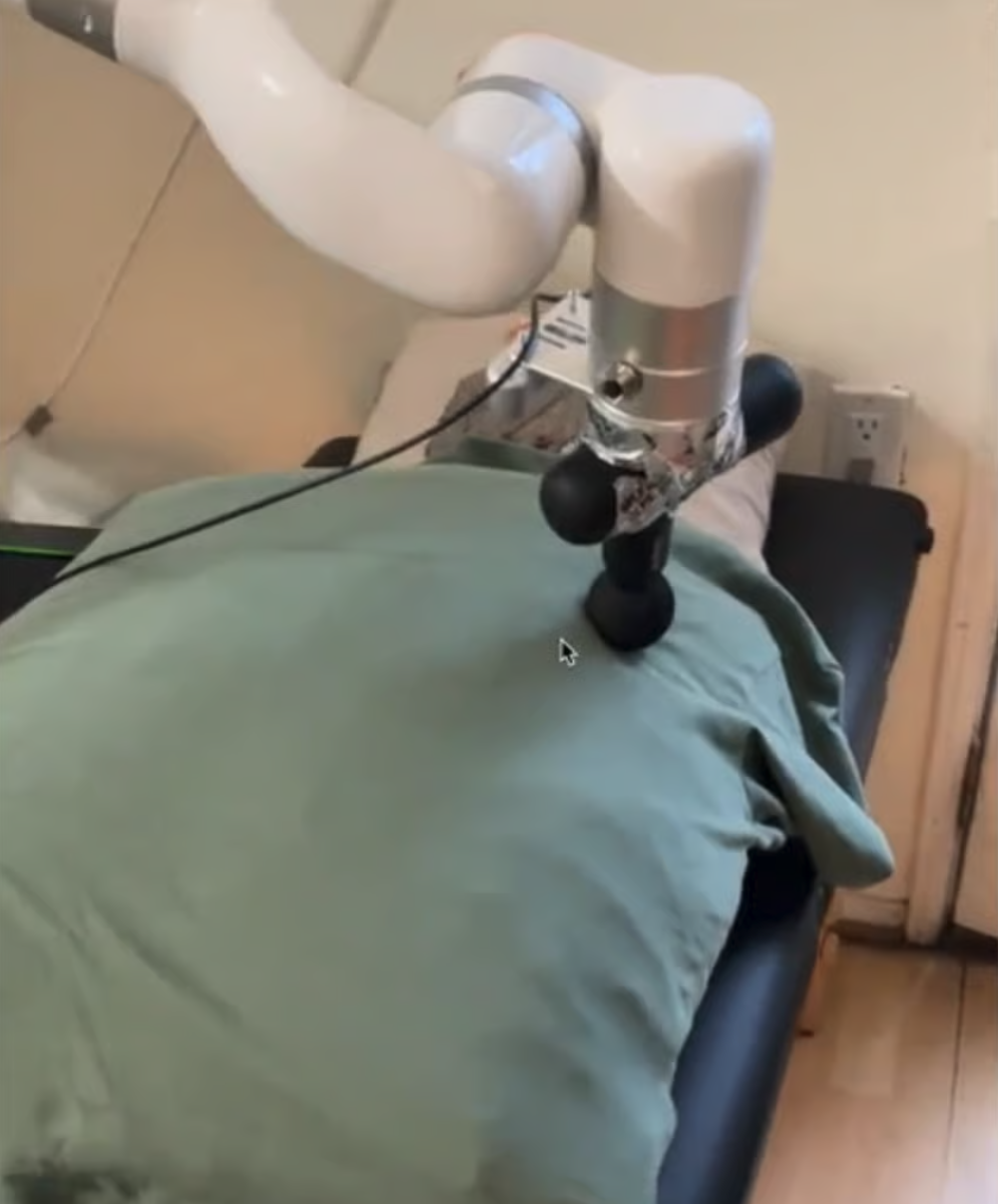So, while thinking about this macro trend, I was staring at the robotic arm on my desk and thought, “Maybe introducing some hardware is another way to reduce the number of people building the same thing.” I settled on the use case of an upper back massage using a TheraGun attached to a 6-axis robotic arm. The arm itself can be fixed; it doesn’t need to move on a linear rail or cart to navigate 3D space. I can just focus on the actual massage, and thankfully, most humans have very similar-looking upper backs. This is a very constrained domain and a perfect opportunity to test training a robotic arm to do one specific task.