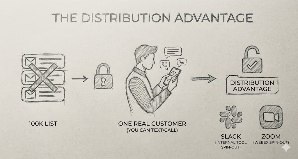 Usually, people think distribution means an email list of 100k people. But often, a distribution advantage just means one real customer you can text, call, or slack (preferably just see in person or text). It means finding a problem where you are right now, with the people you already have access to.